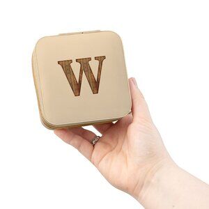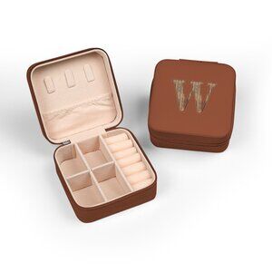 A compact jewelry travel case designed to keep treasured pieces safe and neatly arranged on the go. The soft-plush interior cushions rings, studs, and delicate chains while divided compartments and ring rolls prevent tangles. Lightweight PU leather exterior with a secure square zip-around closure slips easily into a carry-on or tote. Subtle personalization-ready top adds a warm, handmade touch to every journey. Carry it to markets, weekend getaways, or business trips — it keeps small collections accessible and protected without taking up space.