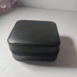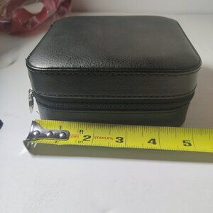 5" x 5" x 2.5" Black faux leather travel mirrored jewelry case. Zippered for security with Heart zipper pull. one side has 4 compartments and ring holders.