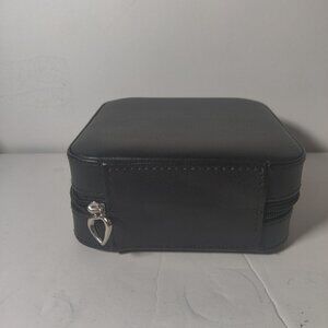 5" x 5" x 2.5" Black faux leather travel mirrored jewelry case. Zippered for security with Heart zipper pull. one side has 4 compartments and ring holders.