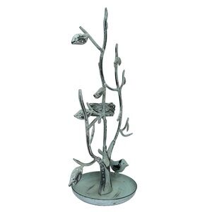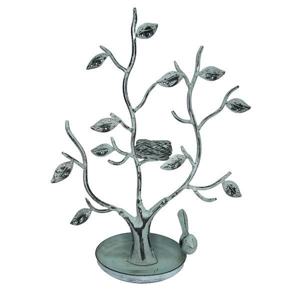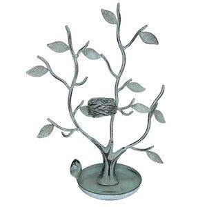 This beautiful metal jewelry tree features a bird perched on the base, and a nest in the tree.