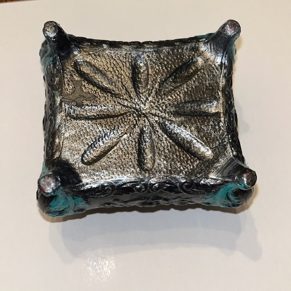 I used acrylic paints on the outside. Gunmetal Gray & Turquoise Blue. Over washed it with a metallic Black & sealed with a poly acrylic.