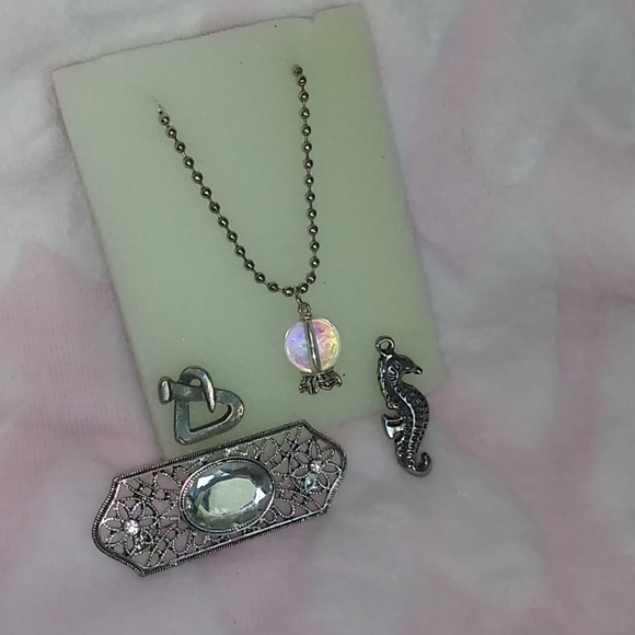 Two necklace charms, one necklace chain, and two pins.
