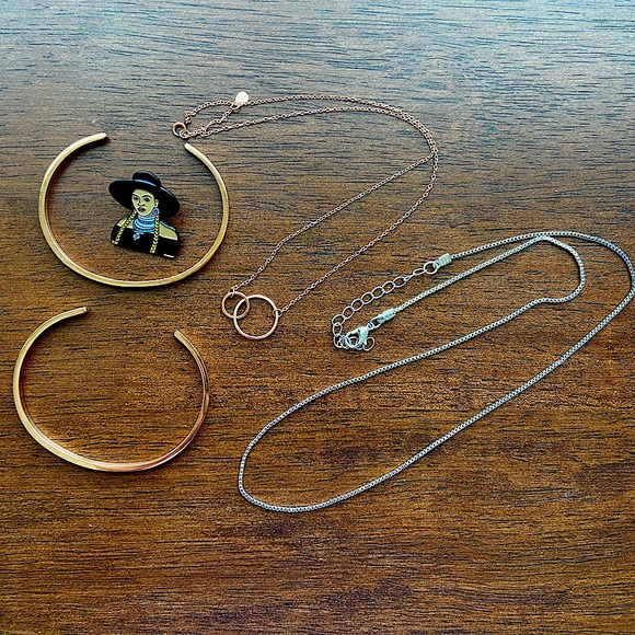 Two necklaces, two cuff bracelets and a pin. Will not spit up this bundle.