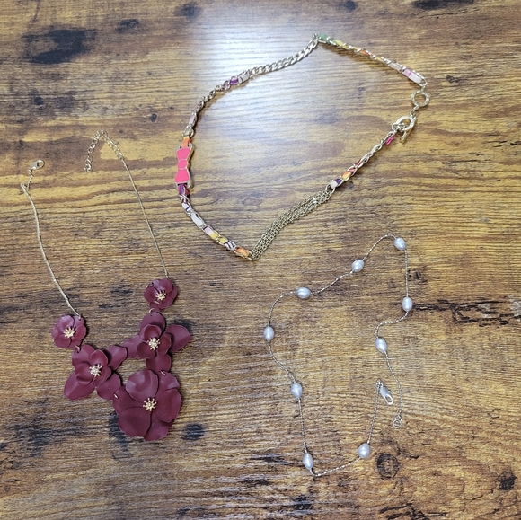floral necklace from Francesca's, double wrist wrap bracelet from Vera Bradley, and silver pearl style necklace.