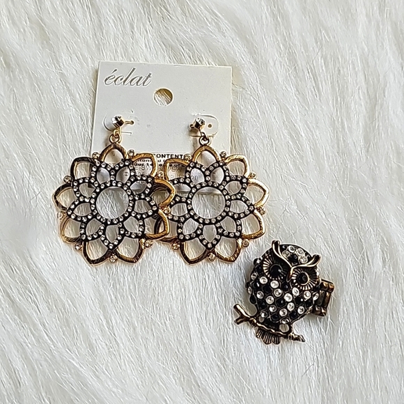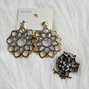 set of NEW earrings and owl ring.