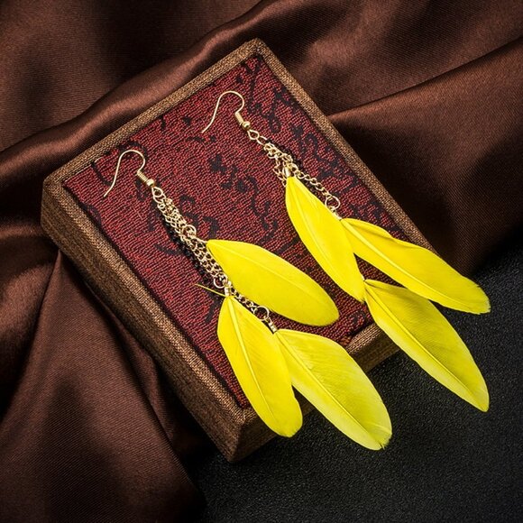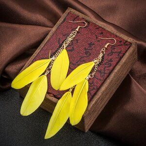 These are brand new approximately 5" long drop earrings with yellow feathers. The finished weight for both earrings is 2 grams.