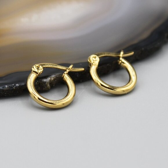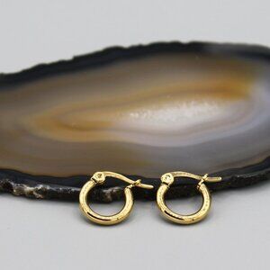 Brand new pair of 10mm wide hoop style earrings made out of yellow gold plated stainless steel. The total weight for the pair is 2 grams.