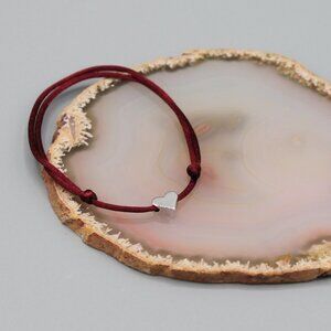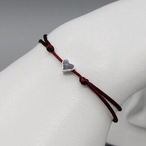 This is a brand new adjustable burgundy string bracelet with a heart design which approximately measures 1/4" x 1/4" large. The finished weight of the bracelet is 1 gram.