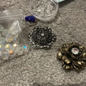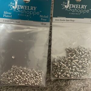 Bundle of open rings, crimp beads, pinch crimps, misc items, plastic bag of glass crystal beads and other assorted items.