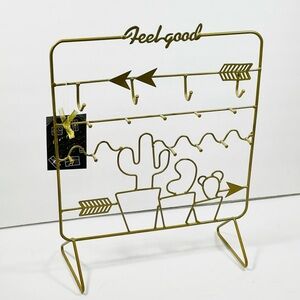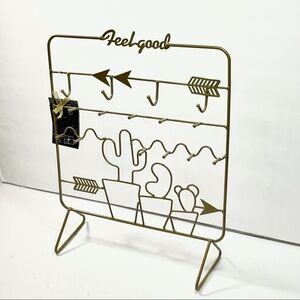 Jewelry organizer rack display with cute southwestern cactus, arrows and hills design and the inspirational words "Feel Good" for organizing your earrings, bracelets, anklets and necklaces, brand new with tags and a gift tag, perfect for a holiday or birthday gift! Features four hooks and 11 pegs for necklaces, anklets and bracelets and lots of space on the bars, the words and through the feather in the arrows for earrings - wherever you want to organize them.