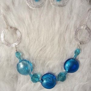 Silver chain necklace with aqua glass beads. Matching earrings.