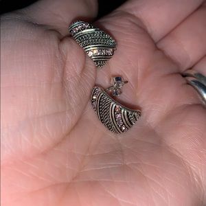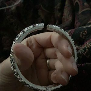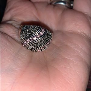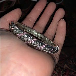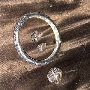 Hinged bracelet with pink rhinestone. Comes with matching ring and earrings. You will notice from photos that one earring is missing the earring back