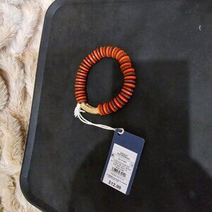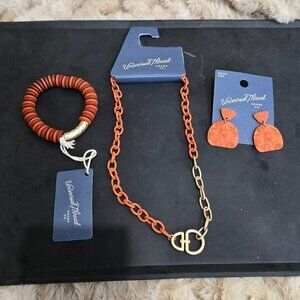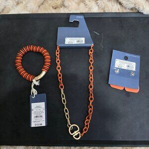 This set of universal Thread is a necklace, bracket and earrings. It is orange and gold tone. Brand new with tags and on card. Necklace is 20" long
