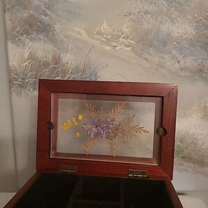 Pre-owned in good used condition. The box is approximately 7.5 inches long ,approximately 5 inches tall and approximately 5.25 wide. The box has a hinged lid with a floral accent on the top .The top is lined and so is the bottom drawer.