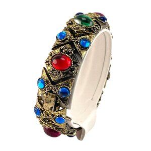 This Jewels of India Cabochon Bracelet is a rare, chunky, gold-tone statement piece from the 80s. It features vibrant jewel tones of red, blue, and purple in glass, set into gold-tone metal. Sized at 7.5".