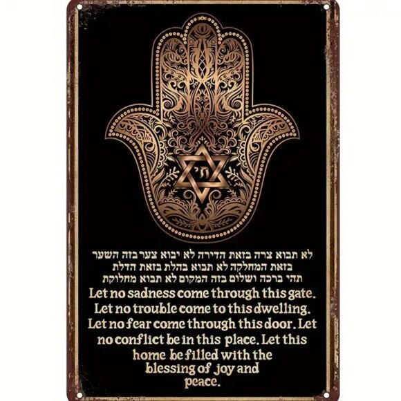 This **Jewish Hamsa Hand Home Blessing Sign** is not only a decorative piece but also a symbol of deep spiritual significance. The vintage-style 8x12 inch metal sign features the Hamsa hand, a powerful symbol in Jewish tradition, believed to protect against the evil eye and bring blessings into the home.