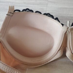 Beautiful bra, new without tags, a gift that has been wrapped sitting in lingerie chest. Not my size for a long time. It needs to be appreciated and worn. The bra features a beautiful blend of polyester, nylon, and spandex fabrics with an opaque nude color and black lace accents for a touch of elegance. The push-up style and underwired design provide a flattering lift, while the adjustable straps and back closure ensure a comfortable fit. Flattering, flirty and very feminine.