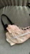 Chic ruffled lace design. Soft pink with bold black straps. Perfect for a stylish touch.