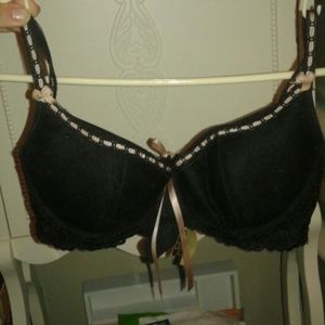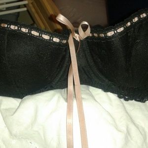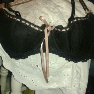 Black Jezebel 34C sexy lingerie bra with black lace, mesh, and light pink ribbon & tiny bow accents.
