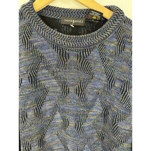 The Jhane Barnes VTG Textured Blue Waves Sweater in size L is a chunky-knit pullover sweater designed for men. Made from a blend of mercerized cotton and wool, it features a unique geometric pattern of blue waves. This sweater has a crew neck and long sleeves, making it suitable for various occasions like travel, parties, or casual wear. With its vibrant colors and 90s-inspired theme, this sweater offers a mix of classic and colorful style elements, perfect for adding a statement piece to your wardrobe.