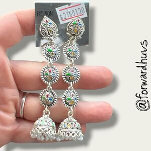 Celebrate vibrant tradition with these new Indian-themed statement earrings, crafted in silver-tone metal and adorned with colorful enamel detailing in rich hues of red, green, yellow, and blue. Designed in a classic jhumka style, each earring features a tiered structure with floral motifs and ends in a bell-shaped drop embellished with tiny white beads for added movement and charm.