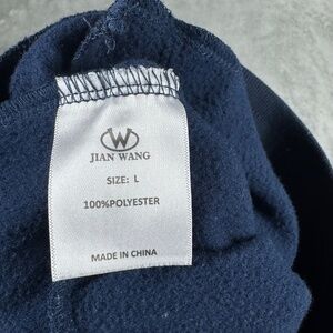 Jian Wang men’s jogger sweatpants in navy blue with white panel accents and embroidered HC logo. Features a drawstring waist, ribbed cuffs, and zippered side pockets. Soft polyester fleece interior makes them comfortable for lounging, sports, or casual wear.