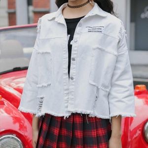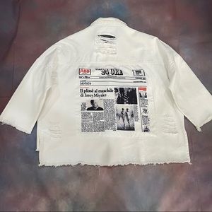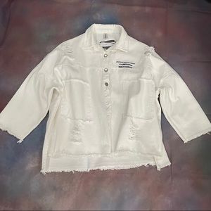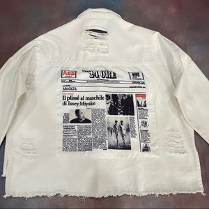 Jiao Ma Hua Drop Shoulder Patch Back Distressed Oversized Denim Jacket size S in White. Oversized fit. Hi-Low. Two front patch pockets. Graphic patch back. Raw edges. 65% Cotton 35% Polyester. Excellent preowned condition. Clean ready to wear. Size tag removed. Measurements taken lying flat.