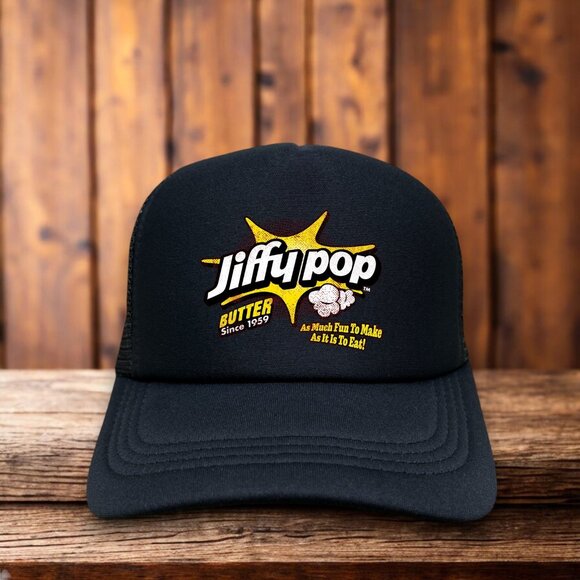 Jiffy Pop Mens Trucker Hat Black Snapback Retro Popcorn Logo Throwback Food Cap