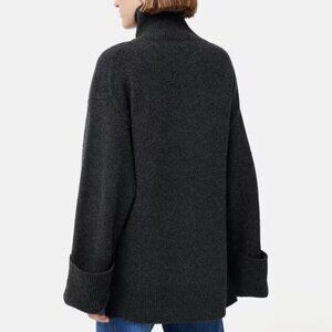 Crafted from pure merino wool, this oversized jumper exudes quiet luxury. Stylish side slits and ribbing details define the silhouette. Wide cuffed sleeves that can be folded back once more for shorter sleeves and bolder cuff detail and the perfect height turtle neck. Beautifully slouchy, style with a slim leg trouser and a chunky leather boot.