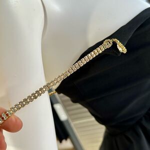Absolutely stunning! Hugs every curve ! Plunging neckline with sheer ruffle wrap accent from the shoulder wraps down to the bottom hem! Crystal studded sleeve and drop pendant! This is sure to turn heads. Side zip closure. Perfect condition except one crystal is cloudy as shown. Can be cleaned ?