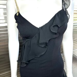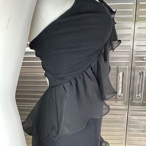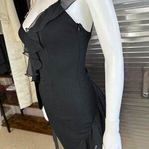 Absolutely stunning! Hugs every curve ! Plunging neckline with sheer ruffle wrap accent from the shoulder wraps down to the bottom hem! Crystal studded sleeve and drop pendant! This is sure to turn heads. Side zip closure. Perfect condition except one crystal is cloudy as shown. Can be cleaned ?