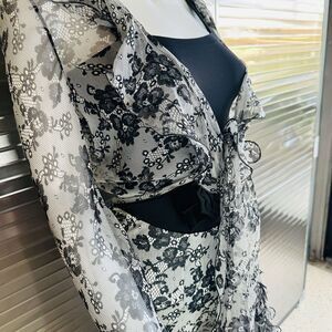 Floral gray, black, white honeycomb pattern with ruffled leg and sexy slit down front of leg. Bottoms are very stretchy with back zip closure. Ruffled sheer crop blouse with tie closure.