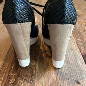 Jil Sander Black Coated Linen Ankle Tie Open Toe Wedge. 4.5” Wood heel. White rubber sole. Leather insole. Satin ankle tie laces. Made in Italy. Size 38 / 8