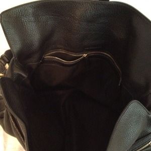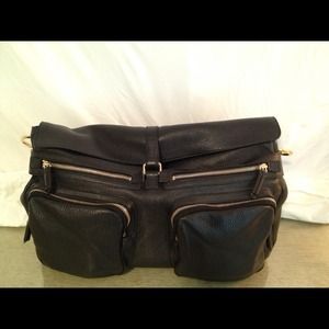 Logo hardware and lots of zippered compartments. 4 on the front, 1 large zippered compartment on the back and another medium sized compartment on the inside. Flap with a snap closure. Great gold tone hardware etched with Jil Sander on the strap. Strap drop 8". 12" long, 5" high. Beautiful black pebbled leather. New without tags. This is a classic!