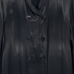 Elegant black trench coat by Jil Sander. Features a sleek design with a glossy finish. Perfect for a sophisticated look.