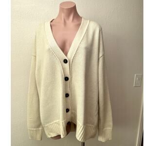 A refined minimalist knit from Jil Sander in a soft cream hue, this sweater features a deep V neckline, front buttons, long sleeves, and a relaxed yet elegant silhouette. The wool / cashmere (or high quality wool blend) construction ensures both comfort and luxury. This versatile sweater works beautifully as a standalone top or layered over a blouse, and can easily dress up for work or evenings out.