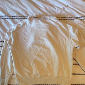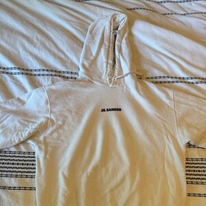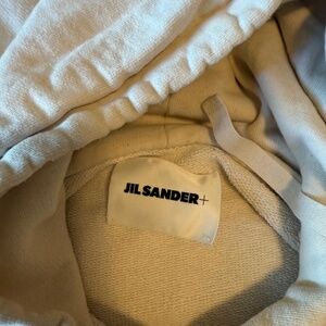 Jil Sander Cream / Ivory hoodie with black logo. Authentic. Women’s Medium. Fabric is sort of ‘natural’ and has flecks in the off white color so I have photographed the slightly larger irregularities. See photos. These are not stains and I will not accept returns for these. They are barely noticeable but I thought I should mention them. Only worn a few times.