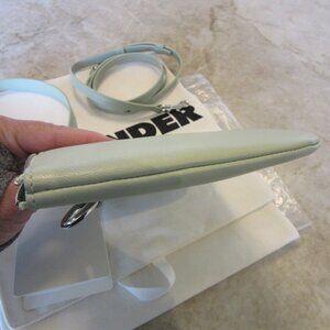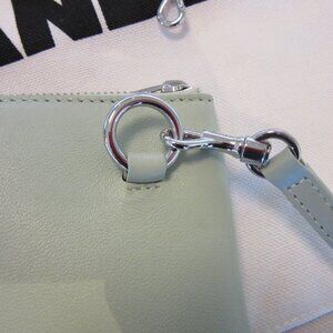 Authentic Jil Sander medium "Link" handbag in aquamarine lambskin leather with shiny silver hardware. New with original tag. The color is stated as "aquamarine" but I think it is closer to mint green. Comes with 2 detachable straps so it can be worn with the longer, adjustable strap on the shoulder or crossbody, or carry it with the shorter, slightly thicker strap by hand or in the crook of the arm. Zipper closure with silver metal pull tab. Interior is fabric lined in a substantial dark grey material. This is the "medium" Link bag, but it is really a small or mini bag that measures approximately 7 5/8" long x 5 1/4" high. It easily fits my 6 1/4" cell phone and there is still space for a card holder and lip gloss and maybe another small item or two, such as cash and a key.