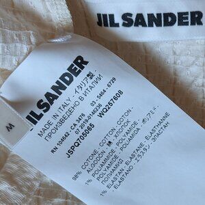 This is a Jil Sander Tank Dress in a cream color. It is in excellent condition. It is a size medium, and the last two images show measurements. Lightweight textured knit fabric made of 98% cotton 1% polyamide 1% elastane, with allover pin-tucking detail. Slim fit, midi length, slip-on style, scoop neck, sleeveless, racerback, unlined, dolphin curved side vents at the hem. Made in Italy.
