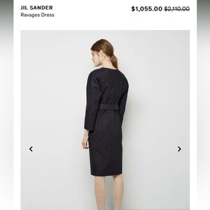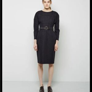Round neck. Long sleeves. Pleated shoulder. Side seam hip pockets. Graphic seams throughout. Delicate, concealed back zip. Belt in identical fabrication with silver hardware is included. Straight fit. Length hits below the knee.