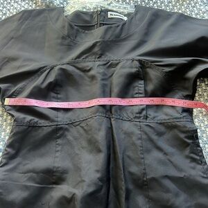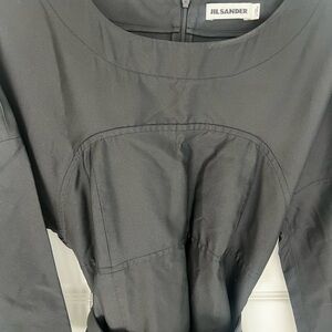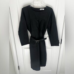 This elegant black dress features a stylish belted design, perfect for any occasion. Its sleek silhouette offers a flattering fit, making it a versatile addition to your wardrobe. Excellent, preowned condition no noticeable flaws Fi tted, longsleeve dress with graphic seams & an optional belt in a raffia-like plaited weave. Round neck. Long sleeves. Pleated shoulder. Side seam hip pockets. Graphic seams throughout. Delicate, concealed back zip. Belt in identical fabrication with silver hardware is included. Straight fit. Length hits below the knee. Color: Black. 100% cotton; Components: 76% cotton, 19% silk, 5% polyamide. Made in Italy. Fit Comments Length 41. Picture measurements in photos for bust and waist. Size 10 us conversion