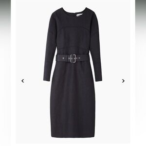 Fi tted, longsleeve dress with graphic seams & an optional belt in a raffia-like plaited weave.