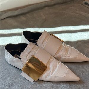 Elegant white flats with bold gold buckle. Perfect for a chic look.
