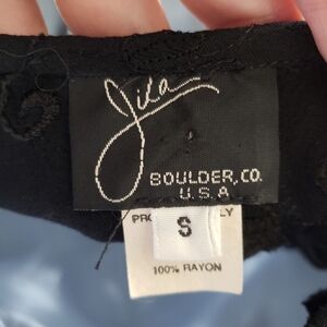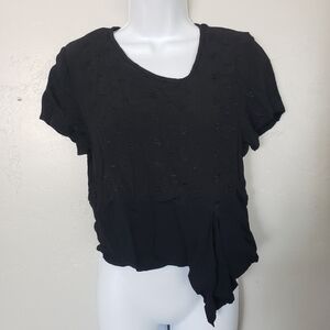 Jila Vintage Women's Small Black Short Sleeve Blouse Asymmetrical Hem Embroidery