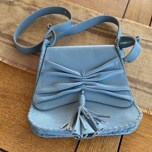 Jill Haber crossbody tassel bag in slate gray blue. High end leather bag!