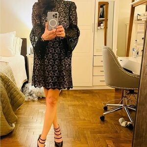 Black lace (100% Polyester). Long sleeves. High neckline. Hourglass. Hidden back zipper with hook-and-eye closure. Partially lined. Hidden side pockets. 34” from shoulder to hemline. Imported.