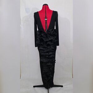 This is not your boring LBD. Very simple from the front, with high neckline, long sleeves and rouching at the waist. The fun is all in the back! Deep cut, ending at a large crinkled silk bow, that cascades to the floor.