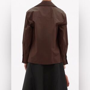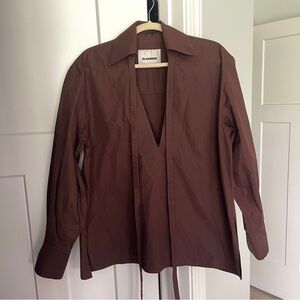 Jill Sander Tie-neck Organic-cotton Poplin Brown Blouse Long Sleeve V Neck