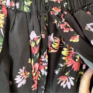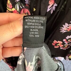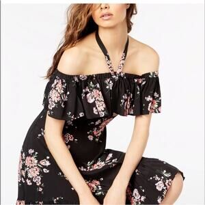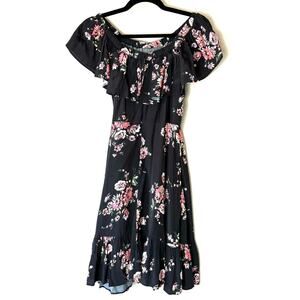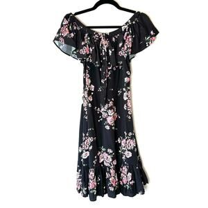 Excellent used condition! Black and pink floral dress. Ruffled off the shoulder yoke with tie at bust that can be worn laying flat or around the neck as a halter style. Unlined and lightweight with back zip closure. Imagine as a wedding guest dress with heels or make it more casual with a pair of flats or sandals.