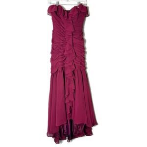 Excellent condition! Burgundy gown with a slight high low hem. Chiffon overlay with large ruffle down the middle. Ruched bodes with a mermaid flared bottom hem. Sweetheart bust with back zip closure. Perfect as a wedding guest dress or other special occasion.